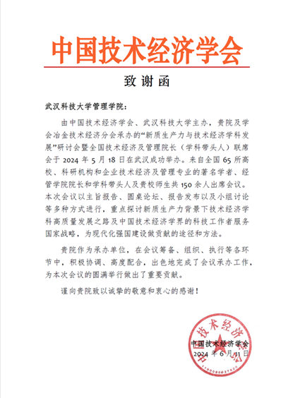 2024年6月11日,中国技术经济学会向新葡萄官网发来致谢函,感谢新葡萄官网在2024年5月18日在“新质生产力与技术经济学科发展”研讨会暨全国技术经济及管理院长(学科带头人)联席会中所做的工作。