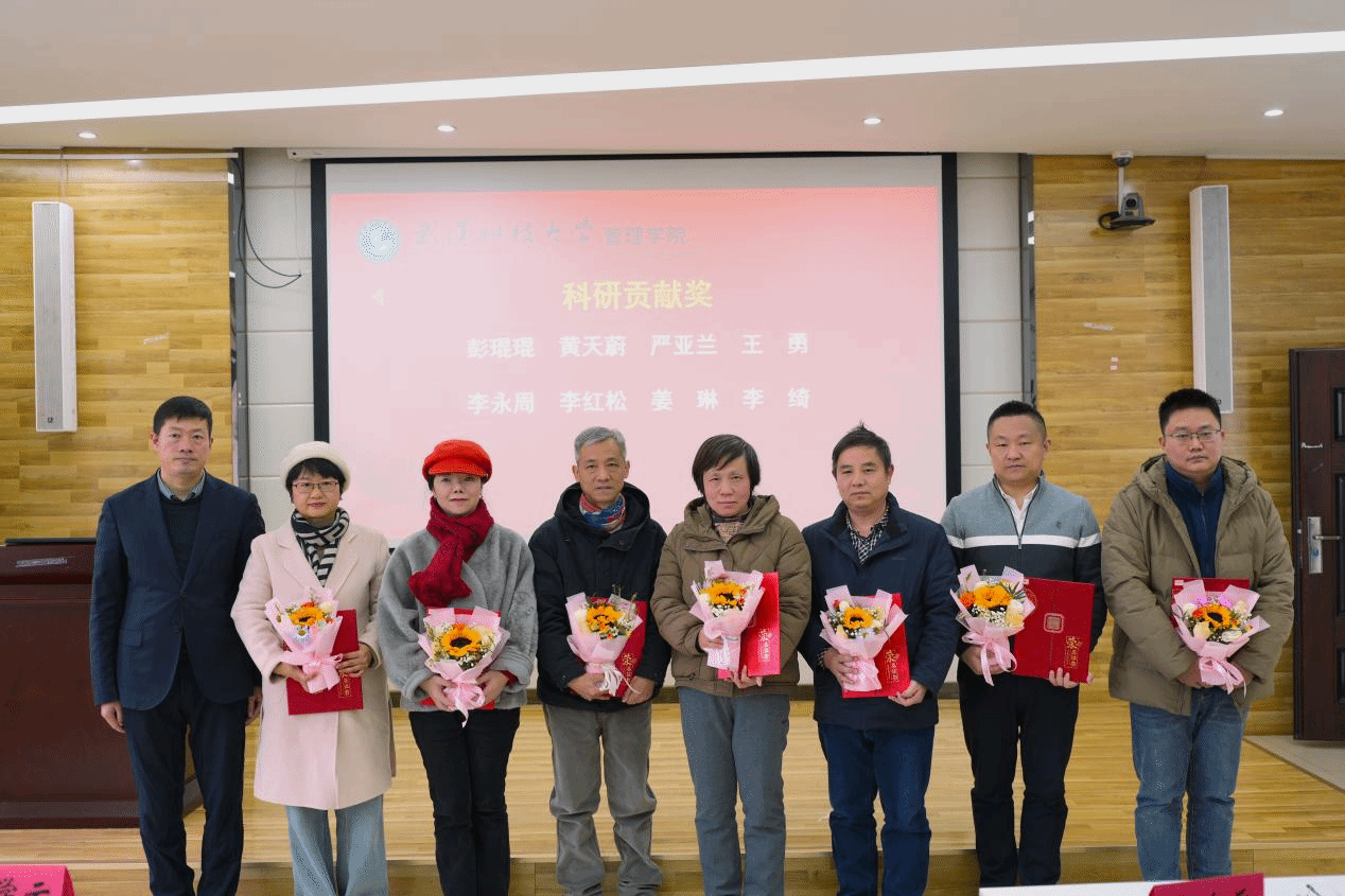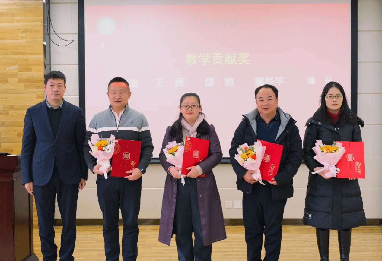 在表彰环节,伴随着热烈的掌声,受表彰的教职工依次上台领奖。此次表彰共设立教学贡献奖、科研贡献奖、管理服务贡献奖三类,共二十一名教师获奖。刘海兵、伍学云为获奖教师颁奖并赠送鲜花。