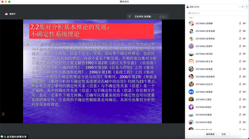 赵克勤研究员在主题报告中回顾了上世纪60年代对集合论中罗素悖论引发的第3次数学危机的思考,70年代对人生2只眼睛的猜想,80年代把自然辩证法与数学联系起来创建联系科学的梦想;综述了从1989年提出集对分析到目前为止的集对分析原理、理论、方法和广泛应用的发展进程;以基于集对分析的天气降水预报、水文水资源评价、投资风险和区域创新集对分析、不确定性智能决策的联系数建模,联系数在贝叶斯推理决策、群体智能测算、企业精准管理中的应用等等为例,说明集对分析对系统不确定性坚持“客观承认、系统描述、定量刻画、具体分析”16字方针的重要性、必要性和有效性。会后学院师生对本次报告给予了高度评价,生动而贴切实践的报告激发了学生们学习探索的热情和探讨科学的浓厚兴趣。