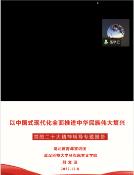12月8日,新葡萄官网在线上腾讯会议召开全院大会,省青年宣讲团成员、新葡萄8883官网AMG官网马克思主义学院副院长、教授刘文波,受邀为新葡萄官网做党的二十大精神集中宣讲。会议由学院党委书记伍学云主持,全体教职工和学生党员代表聆听了宣讲。