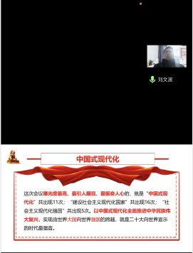 刘文波教授以《以中国式现代化全面推进中华民族伟大复兴》为题,围绕二十大的概况及重大意义、中国式现代化的实践基础、中国式现代化的理论指南、中国式现代化的核心要义、中国式现代化的战略部署、中国式现代化的总体要求等六个方面对党的二十大精神进行了深刻阐释,给学院带来了一场精彩的“思政课堂”。参会人员仔细聆听思考,纷纷表示宣讲报告主题鲜明、条理清晰、联系实际,对学习贯彻党的二十大精神、指导实践具有重要意义。大家表示,要按照党中央要求,在全面学习把握落实上下功夫,以实际行动把二十大提出的各项目标任务落到实处。