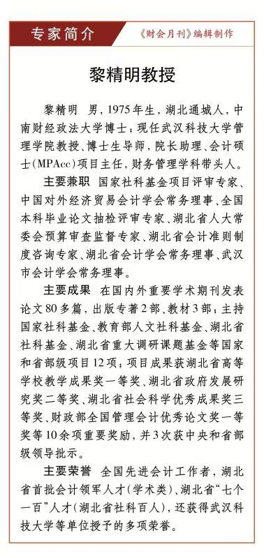 黎精明,博士生导师、院长助理、会计硕士项目主任、财务管理学科带头人。国家社科基金项目评审和成果鉴定专家、中国对外经济贸易会计学会常务理事、全国本科毕业论文抽检评审专家、湖北省人大常委会预算审查监督专家、湖北省会计准则制度咨询专家、湖北省会计学会常务理事、武汉市会计学会常务理事。全国先进会计工作者、湖北省首批会计领军人才(学术类)、湖北省“七个一百”人才,并获得新葡萄8883官网AMG官网等单位授予的多项荣誉。