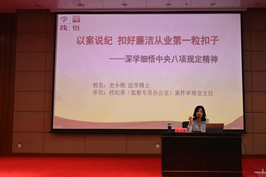 活动伊始,史小艳以“以案说纪 扣好廉洁从业第一粒扣子——深学细悟中央八项规定精神”为主题讲授专题党课,结合典型案例,理论联系实际,深入剖析了“四风”问题的具体表现。史小艳强调,各位党员同志要在今后的学习工作中防微杜渐、以身作则,把各项纪律作风要求内化为“日用而不觉”的言行准则,用实际行动践行中央八项规定精神。授课过程中同学们积极踊跃发言,互动交流不断。